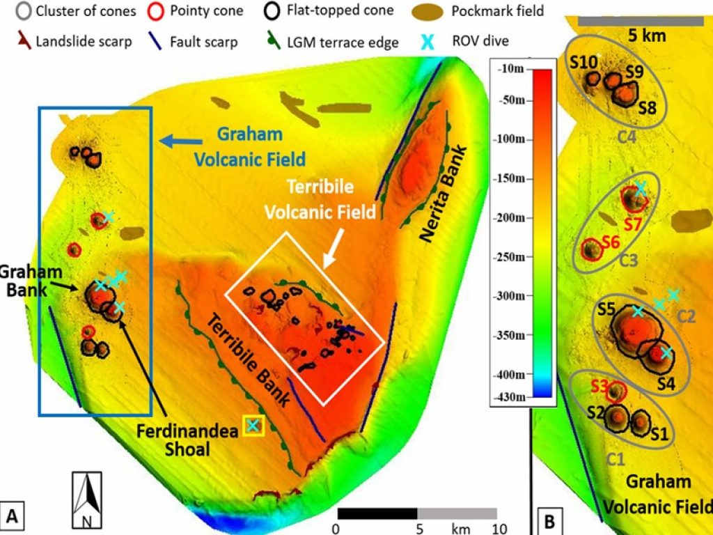 Uno studio recentemente pubblicato sulla rivista “Frontiers in Earth Science” ha permesso di migliorare le conoscenze del Graham Volcanic Field, un’area vulcanica attiva finora poco conosciuta situata nel Canale di Sicilia, circa 40-50 chilometri a largo di Sciacca (AG). La ricerca, curata da Danilo Cavallaro e Mauro Coltelli, ricercatori dell’Osservatorio Etneo dell’Istituto Nazionale di Geofisica e Vulcanologia (OE-INGV), ha consentito di indagare un campo vulcanico situato relativamente vicino alla costa e in un braccio di mare molto frequentato dal traffico marittimo, con l’obiettivo di contribuire ad affinare la stima della pericolosità vulcanica che impatta sulla costa e sulla sicurezza della navigazione.