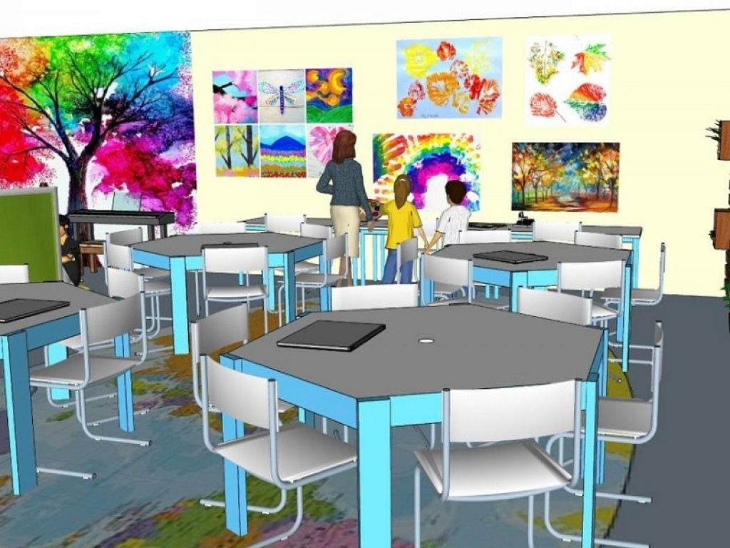 Colorata, multifunzionale, bella, un luogo dove apprendere e far pratica. Questa è la classe immaginata da Stefano Poli uno studente della IA dell’istituto comprensivo ‘De Petra’ di Casoli, in provincia di Chieti. Una zona tv e teatro con le costellazioni e il sistema solare sulle pareti, una zona lettura per la didattica e circle time, ma anche da usare per le lezioni di musica. Una zona creativa dedicata all’arte e alla pittura, dove poter curare i giardini verticali, un’area per i lavori di gruppo e un tavolo da lavoro per il docente con uno schermo interattivo e un enorme planisfero sul pavimento. Ha pensato anche a un compagno speciale che ha chiamato wall-e, un robot per giochi interattivi che si aggira libero per l’aula.