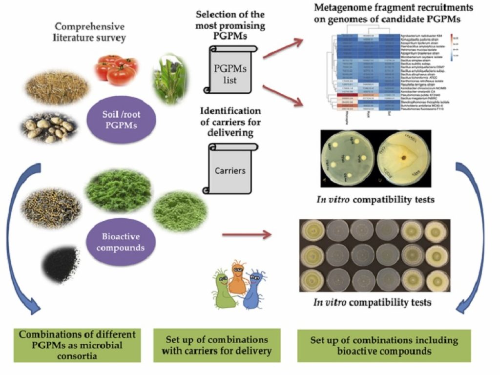 I ricercatori dell’ENEA hanno sviluppato comunità di microbi benefici, quasi dei ‘cocktail’ di batteri e funghi, mettendo insieme microrganismi promotori della crescita delle piante (i cosiddetti Plant Growth Promoting Microorganisms, PGPMs) selezionati a seguito di una sistematica rassegna di letteratura e della loro capacità di coesistere in vitro. Queste attività, i cui risultati sono stati pubblicati sulla rivista Microorganisms – MDPI, si sono svolte nell’ambito del progetto SIMBA[3], finanziato dal programma Horizon 2020. La combinazione di consorzi microbici con composti naturali bioattivi (idrolizzati proteici di origine vegetale, selezionati nello studio) e l’uso di idonei ammendanti (identificati nell’ambito del progetto) consentiranno di incrementare la fertilità del suolo e migliorare resa e qualità delle colture.