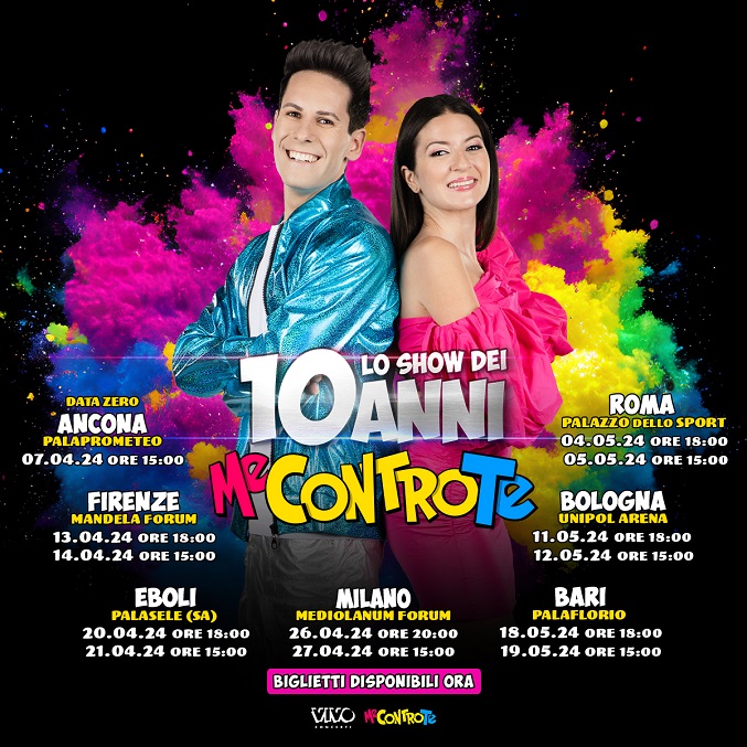 Il nuovo spettacolo dei ME CONTRO TE partirà da Ancona (domenica 7 aprile 2024 alle ore 15:00, Palaprometeo), e proseguendo con una serie di doppi appuntamenti nelle città di Firenze (sabato 13 aprile 2024 ore 18:00 e domenica 14 aprile 2024 ore 15:00 al Mandela Forum), Eboli (SA) (sabato 20 aprile 2024 ore 18:00 e domenica 21 aprile 2024 ore 15:00 al Palasele), Milano (venerdì 26 aprile 2024 ore 20:00 e sabato 27 aprile 2024 ore 15:00 al Mediolanum Forum), Roma (sabato 4 maggio 2024 ore 18:00 e domenica 5 maggio 2024 ore 15:00 al Palazzo dello Sport), Bologna (sabato 11 maggio 2024 ore 18:00 e domenica 12 maggio 2024 ore 15:00 all’Unipol Arena) e per concludere a Bari (sabato 18 maggio 2024 ore 18:00 e domenica 19 maggio 2024 ore 15:00 al Palaflorio).