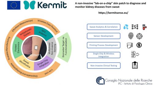 Un cerotto cutaneo, un “lab-on-a-chip” non invasivo per diagnosticare e monitorare le malattie renali a partire dal sudore: questo è il progetto KERMIT, https://kermitsense.eu, finanziato dal l’UE per lo sviluppo una piattaforma semplificata e accessibile per l’individuazione di biomarcatori – presenti nel sudore – relativi alle malattie renali.