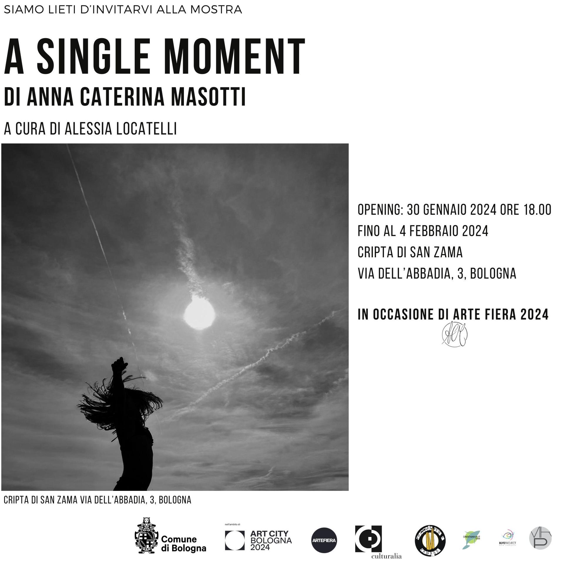 Nell’ambito di ART CITY Bologna 2024 in occasione di ARTEFIERA, Anna Caterina Masotti presenta per la prima volta le sue fotografie nella mostra “A Single Moment”. L’esposizione, a cura di Alessia Locatelli, è allestita presso la Cripta di San Zama nel pieno centro storico di Bologna, dal 30 gennaio al 4 febbraio 2024, in collaborazione con Laura Frasca, Art Manager di Green Whale Space, e l’Associazione Succede Solo a Bologna.