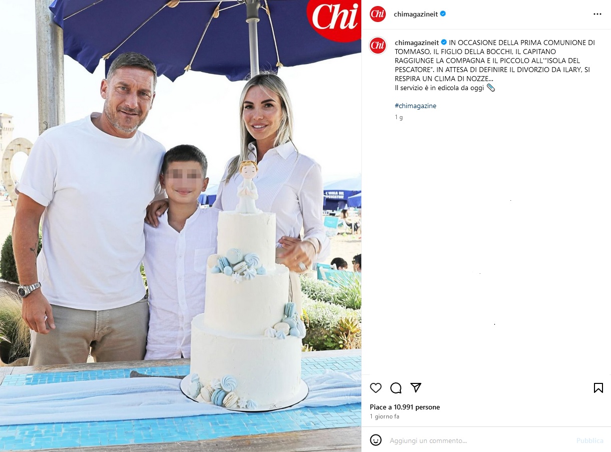 Su Instagram, la Bocchi ha pubblicato uno scatto di lei e Tommaso. Tra i commenti quello di Totti: “Belli”, scrive l’ex numero 10 pubblicando due cuori. Totti e Bocchi sono più affiatati che mai e il Pupone ha instaurato un bel rapporto con i figli di lei, Tommaso e Sofia. I due bambini sono molto legati a Isabel, terzogenita di Totti e Blasi. Al momento della comunione, però, la bambina era in vacanza a Malta con la mamma e il compagno Bastian Muller.