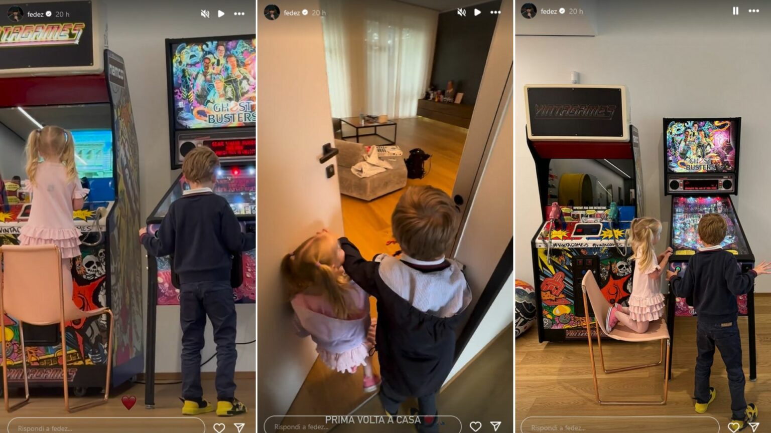 “Prima volta a casa”, scrive il rapper, spiegando ai bimbi che la casa “è ancora da sistemare”. I bimbi sembrano già a loro agio negli spazi che l’artista sta arredando poco alla volta. Così li si vede giocare ai videogiochi, con un libro della Marvel e con un mixer.