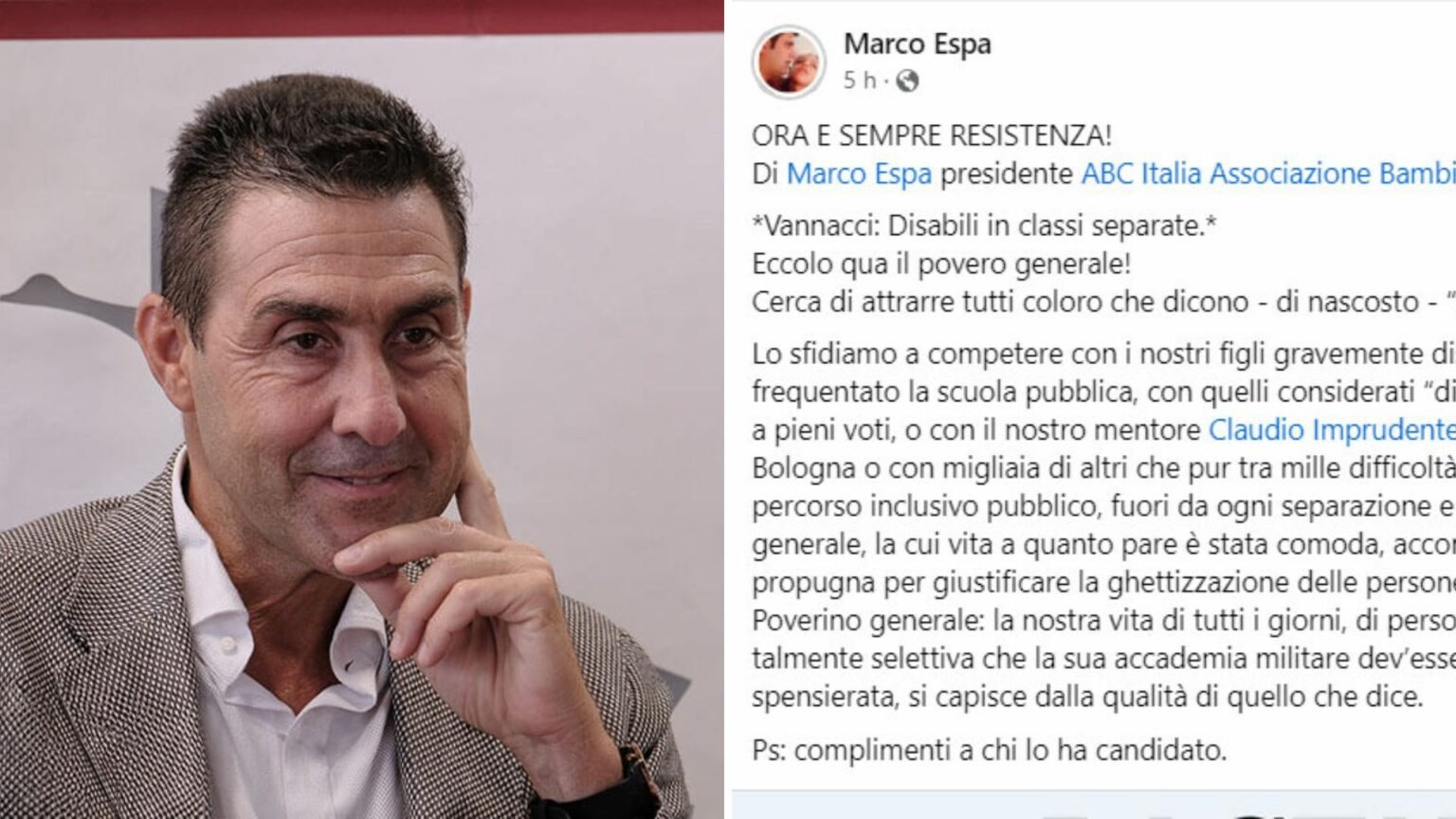 Qui il post integrale di Espa, che nel 2014 ha perso la figlia Chiara affetta da una grave menomazione cerebrale dalla nascita: “Eccolo qua il povero generale! Cerca di attrarre tutti coloro che dicono – di nascosto – ‘eh, però dai ha ragione‘. Lo sfidiamo a competere con i nostri figli gravemente disabili, che frequentano e hanno frequentato la scuola pubblica, con quelli considerati “disabili mentali” che si sono laureati anche a pieni voti, o con il nostro mentore Claudio Imprudente, laurea honoris causa all’Università di Bologna o con migliaia di altri che pur tra mille difficoltà, sono orgogliosamente dentro un percorso inclusivo pubblico, fuori da ogni separazione e ghettizzazione, come piacerebbe al generale, la cui vita a quanto pare è stata comoda, accomodante e per nulla selettiva, come lui propugna per giustificare la ghettizzazione delle persone con disabilità. Poverino generale: la nostra vita di tutti i giorni, di persone con disabilità, di madri e padri è talmente selettiva che la sua accademia militare dev’essere stata una passeggiata allegra e spensierata, si capisce dalla qualità di quello che dice. Ps: complimenti a chi lo ha candidato“.
