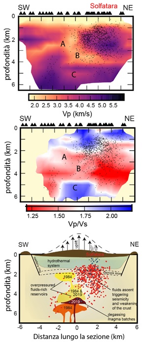 Questo metodo innovativo ha permesso di far luce sulle caratteristiche della velocità crostale fino alla profondità di 6 km, dove le tradizionali tecniche linearizzate hanno sempre mostrato limiti di risoluzione. L’uso di questo metodo, inoltre, ha permesso di individuare per la prima volta tre principali zone di accumulo di materiale magmatico sotto l’area risorgente, corrispondenti alle sorgenti delle deformazioni bradisismiche. Mentre i serbatoi centrali, localizzati a 2.5 e 3.5 km di profondità, rivelano un accumulo prevalente di fluidi in sovrapressione, il serbatoio più profondo, localizzato a 5 km, mostra valori di velocità coerenti con un accumulo di magma.