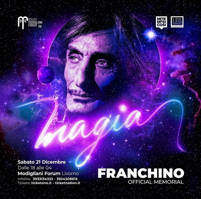 21 dicembre 20024: al Modigliani Forum di Livorno, in una lunga ed eccezionale serata che durerà dal tramonto all’alba, si celebra la figura di un’icona assoluta, popolarissima e felicemente “irregolare” della scena dance italiana, Franchino, prematuramente scomparso lo scorso maggio. Amici di una vita, grandi dj, musicisti di spessore, compagni di mille avventure e semplici fan si raduneranno a migliaia per dare vita ad un evento che resterà nella storia. La “Magia”, ancora un volta, si ripeterà: come Franchino ha sempre fatto in modo accadesse, e come accadrà anche in quest’ultimo, emozionante saluto organizzato dalle persone che più gli sono state professionalmente legate in questi decenni.
