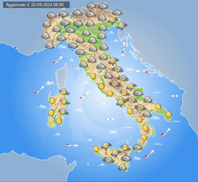 Al Sud e sulle Isole: Al mattino deboli piogge tra Calabria e Sicilia, asciutto con cieli nuvolosi altrove. Al pomeriggio qualche pioggia anche sulle zone interne peninsulari. In serata piogge e temporali in arrivo sulla Sardegna. Temperature minime in rialzo e massime in calo. Venti deboli di direzione variabile. Mari poco mossi o mossi.