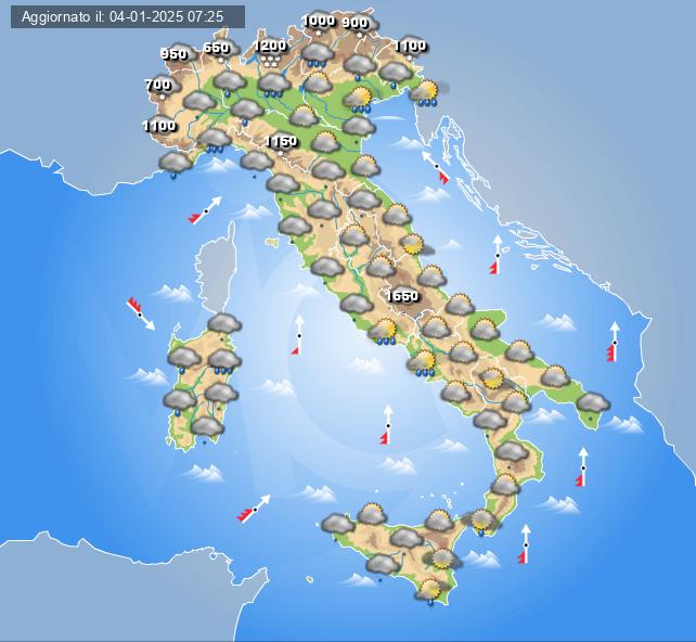 Al Nord: Al mattino tempo instabile su tutte le regioni con piogge e temporali sparsi, neve sulle Alpi fin verso i 700-1000 metri. Al pomeriggio ancora tempo piogge e temporali sparsi e neve sui rilievi, migliora al Nord-Ovest. Tra la serata e la notte tempo in generale miglioramento salvo residui fenomeni sul triveneto. Temperature minime in aumento e massime in diminuzione. Venti moderati dai quadranti meridionali. Mari mossi o molto calmi.