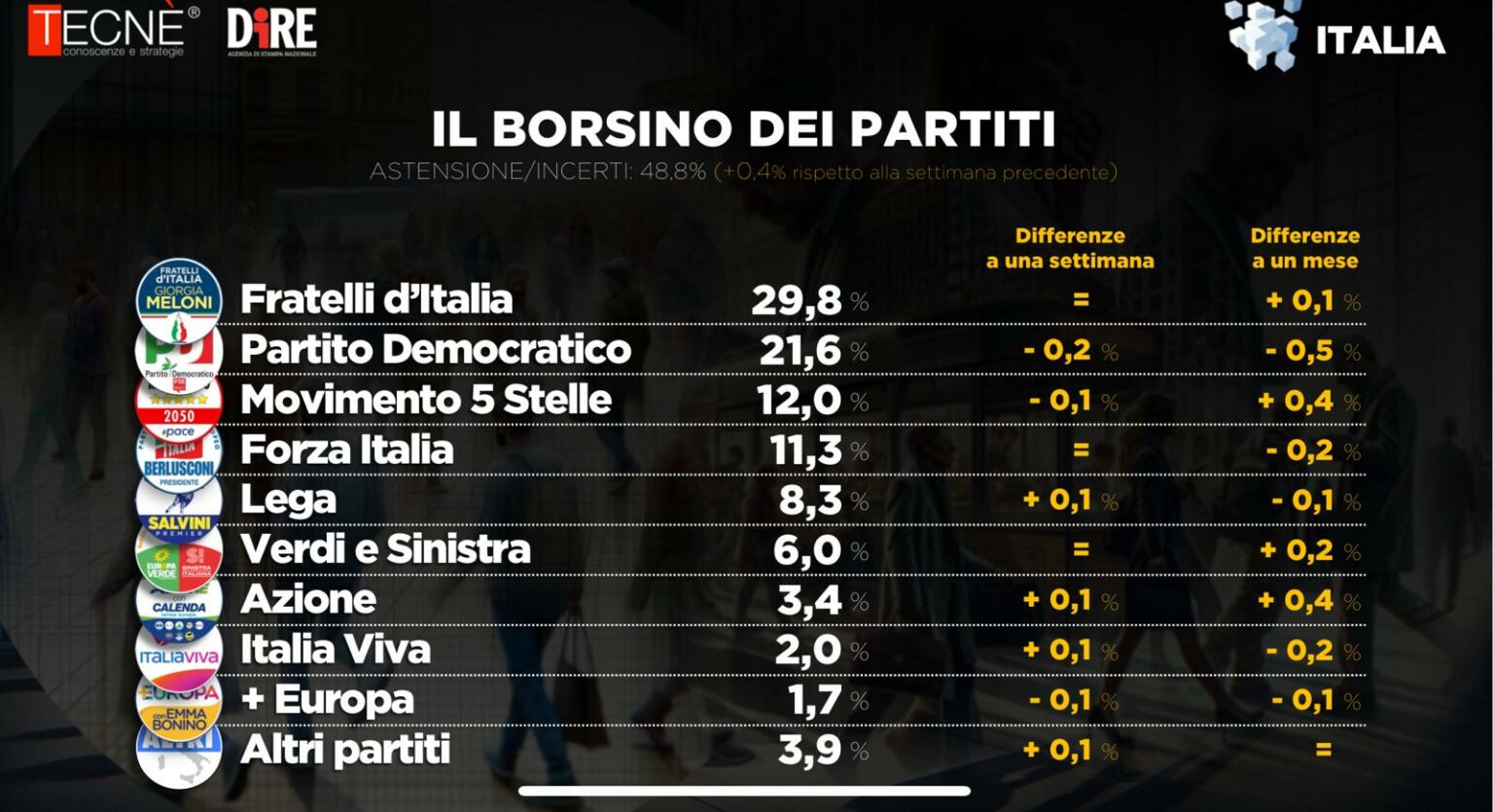 Fratelli d’Italia resta saldamente primo partito con il 29,8% delle preferenze (percentuale invariata rispetto a una settimana fa e +0,1% in un mese). Cala dello 0,2% il Pd ma resta in seconda posizione con il 21,6% (-0,5% nel mese). Sul gradino più basso del podio il Movimento cinque stelle che perde leggermente terreno e si porta al 12% (-0,1 e +0,4%), seguito da Forza Italia all’11,3% (stessa percentuale della scorsa settimana ma -0,2% nel mese). La Lega guadagna lo 0,1% e si porta all’8,3%, Verdi e Sinistra fermi al 6%. Chiudono la classifica Azione al 3,4%, Italia Viva al 2% e +Europa all’1,7%.