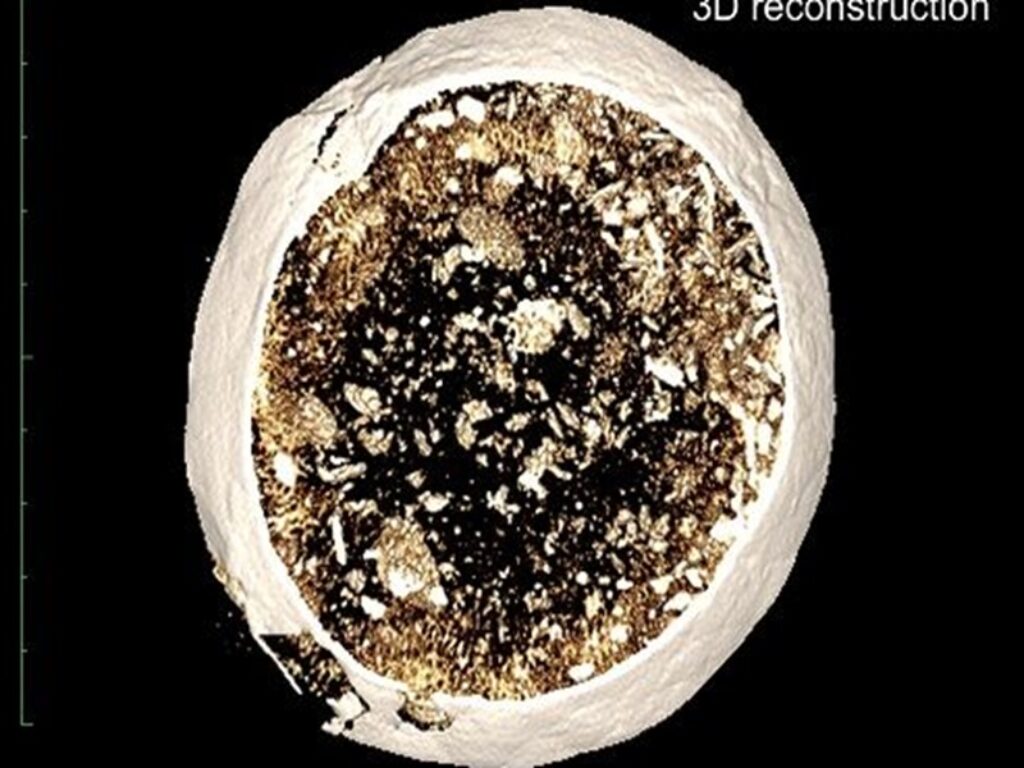 Le indagini sono iniziate con la micro-tomografia presso il Cnr-Ifac. Questa tecnica ha permesso di scandagliare le microstrutture all’interno delle uova, rivelando dettagli sorprendenti come il guscio collassato, fratture superficiali, residui di infiltrazioni antiche e recenti e probabili residui cristallizzati del contenuto originale. Le tomografie hanno inoltre consentito una ricostruzione tridimensionale completa dell’intero uovo, fornendo una visione dettagliata che sarebbe stata impossibile con metodi tradizionali. Successivamente, le uova sono state sottoposte a tomografia computerizzata; dato che i reperti si presentavano parzialmente inglobati nella roccia circostante, la TC è stata fondamentale per visualizzare le parti nascoste e ricostruire la forma originale del fossile, rendendo visibili particolari che il sedimento aveva celato per milioni di anni. Nella matrice di nido che circonda entrambi i reperti, si notano frammenti di guscio appartenenti ad altre uova presenti.
