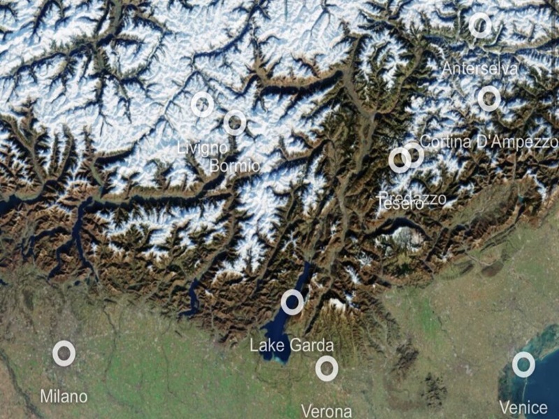 La parte superiore dell’immagine mostra spettacolari montagne e valli delle Alpi, senza nuvole. A nord-ovest è possibile individuare Cortina d’Ampezzo, la Perla delle Dolomiti, già sede dei Giochi del 1956, mentre più a est le acque blu intenso del Lago di Garda si stagliano al centro dell’immagine.