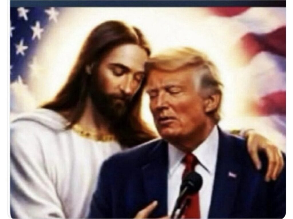 “Ai fanatici della sinistra radicale questo potrebbe non piacere, ma io penso che sia piuttosto carino!!!” ha scritto Trump, nel ricondividere su Truth un post che lo vede abbracciato a Gesù con alle spalle la bandiera americana che si sfuma in una luce abbagliante.